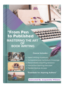 Embark on a transformational journey from aspiring writer to published author with our expertly designed course, “From Pen to Published.” Led by Acquanetta Williams, a seasoned author and acclaimed writing coach, this course offers comprehensive training, personalized coaching, and a supportive learning environment tailored to help you achieve your publishing dreams.